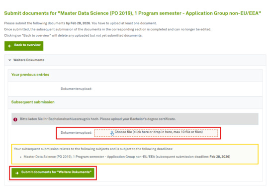 Then be sure to click on the green field for Submit documents for "Weitere Dokumente." Your documents will not reach us if you do not click on that button.