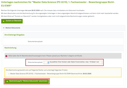 Klicken Sie dann unbedingt auf den grünen Button Nachreichung für "Weitere Dokumente" abschicken. Ihre Unterlagen kommen erst bei uns an, wenn Sie auf den Button klicken.